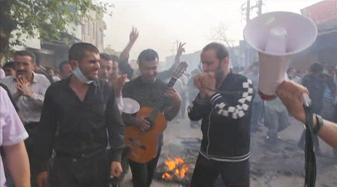 The harmonica motif by Ennio Morricone, from the movie “Once upon a time in the West”, which the artist previously used in his performance, “With Jim White: Once upon a time in the West”, is transformed here into a signal of protest, a call to go forth, and a song for the unexpressed. Hiwa K plays harmonica, with Daroon Othman playing the guitar utilizing megaphones. The day of performance is the last day of legal demonstration, which was subsequently prohibited and when the stage from which the activists were addressing the people was burnt. The artist came twice with the protesters from the Sarai Azadi [Freedom Square] towards the frontier, before and after gas attacks. The inhalation of the teargas through the harmonica internalises again why the protest broke out. The work occurred within the protest and is not a work about the protest.